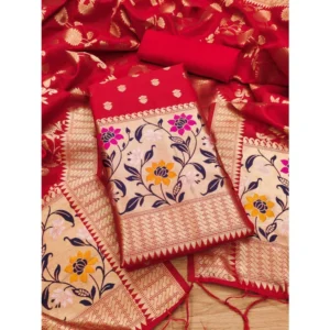 Women’s Banarasi Silk Printed Unstitched Salwar Suit Material With Dupatta (Red, 3Mtrs)