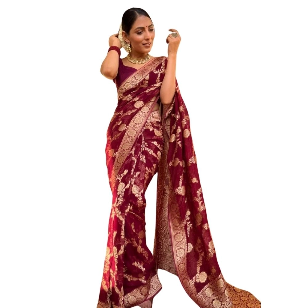 Women's Banarasi silk Saree with Blouse (Wine, 5-6mtr)