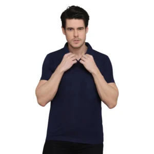 Men’s Casual Half Sleeve Solid Cotton Blended Polo Neck T-shirt (Navy Blue)